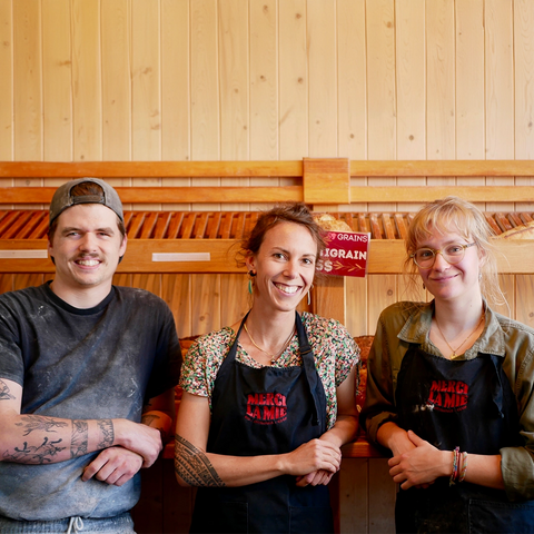 Merci la mie offre des pains délicieux, biologiques, locaux et responsables, soutenus par des valeurs d’économie sociale. Le respect du vivant, le plaisir, l’achat local, la solidarité et la transparence sont au cœur de leur mission. La gamme inclut des pains au levain certifiés biologiques, viennoiseries, muesli et craquelins.